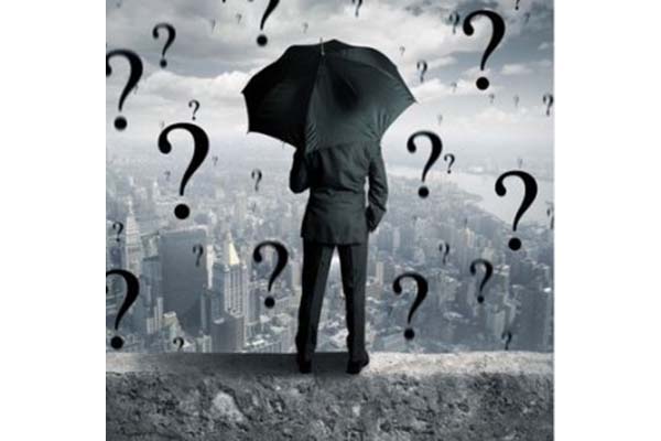 Image of leader holding an umbrella amidst questions.